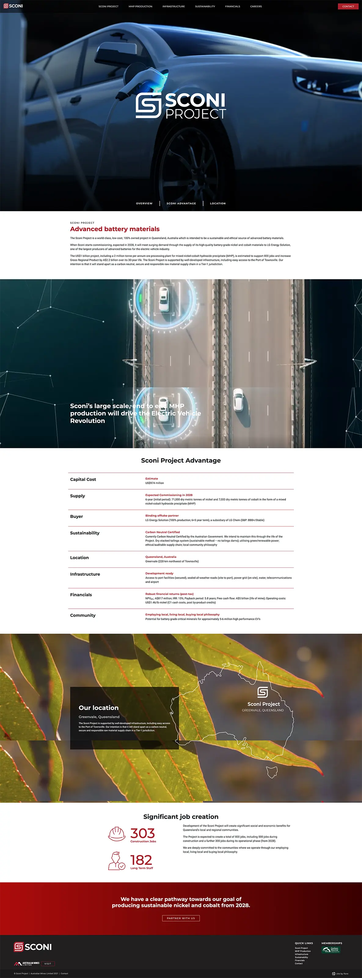 Sconi website’s primary mission is to attract investors for this exciting new large scale operation. Live ASX feeds, eye catching visuals and explanatory diagrams come together to illustrate a clear picture of the projects immense potential to prospective investors. The SCONI website also provides practical and logistical information for development of the project and a timeline of the Projects milestones.